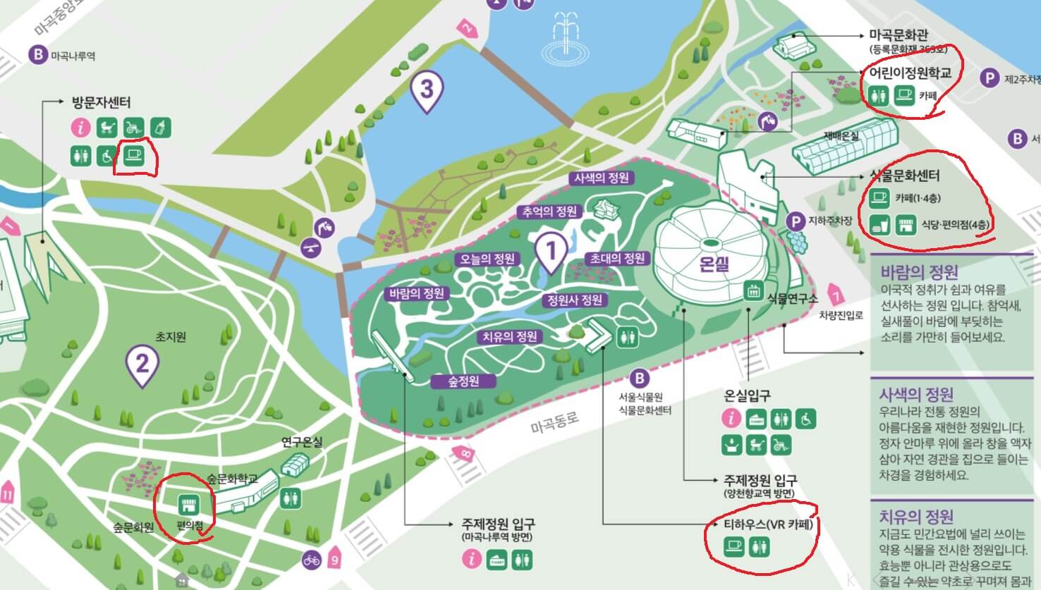 서울식물원 내에 있는 음식점, 카페, 편의점 등 편의시설 정보에 대해서 정리하였습니다. 서울식물원 가기 전에 편의시설 정보 파악하시면 방문 시 도움이 되리라 생각됩니다.
