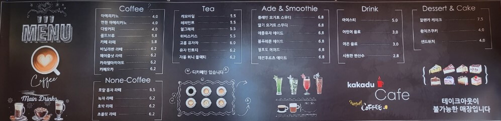 주제정원 내에 카페가 있습니다. 다양한 음료수를 살 수 할 수 있으나, 테이크 아웃이 불가능하다고 합니다. 또한 1인 1 음료가 필수라고 카페 내에 적혀 있었습니다.