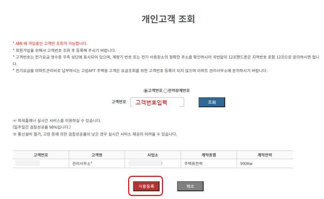 6. 검색된 개인고객 조회 결과를 확인하고 이상이 없다면 '사용등록' 버튼을 누릅니다.